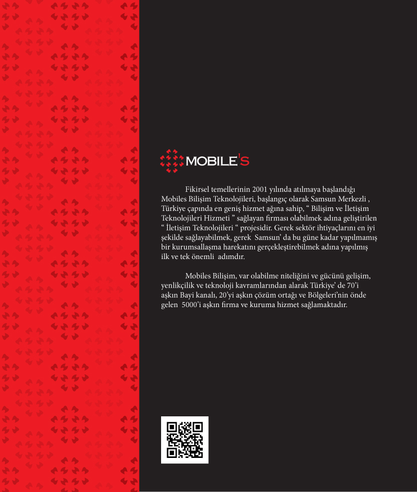 Kuruluşundan bu güne kadar gerçekleştirdiği gibi gelecekte de olaylara gelişime açık ve yenilikçi bir perspektifle yaklaşacak olan Mobiles Bilişim, kurumsal stratejilerinin odak noktasını iletişim sektörü olarak belirlemiştir. Varlığını Bilişim ve İletişim sektöründe sürdüren Mobiles, kurumsal çatısı altında, iletişim sektörü için geliştirdiği hizmetleri gelecekte de sürdürerek, profesyönel çözümler üretmeyi kendisine görev edimiştir. Hızla gelişen teknolojiyle birlikte büyümenin , değişimin ve gelişimin etik bir şart olduğu gerçeğinin farkında olup, lider olabilmeyi ve daha önemlisi lider konumda kalabilmeyi kendisine şart koşmuştur. Gerçek hedef ve stratejilerini "Kaliteli Hizmet "anlayışına yönelik çalışma olarak belirlemiş ve " Bir hizmetin en iyisini gerçekleştirmek ya da hiç gerçekleştirmemek " gerçeğini savunmuştur. Bilişim ve İletişim Teknolojileri sektöründeki derin deneyim ve tecrübelerini kullanarak, en iyi hizmetleri üretecek, varlığını sürdürebilmek, hedef ve stratejilerini gerçekleştirebilmek adına daima çalışacaktır.